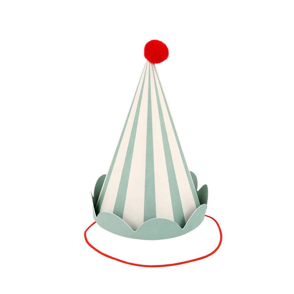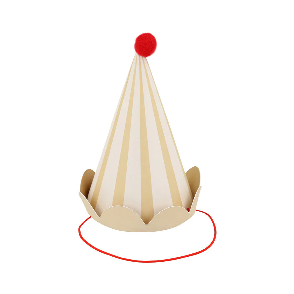 These adorable striped party hats are perfect for early years and baby showers. Inspired by vintage color palettes, with red pompoms and red elastic to keep the look current. A stylish scalloped border adds an extra stylish touch.